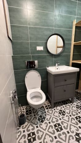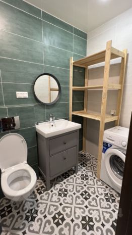 В квартире есть: встроенные шкафы, мебель, кондиционер, тёплые полы, два санузла, большая кухня, стиральная машинка, посудомоечная машина, холодильник и телевизор.
