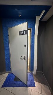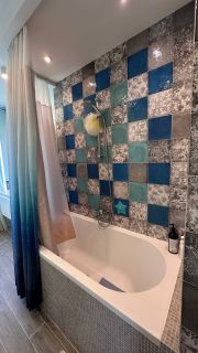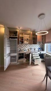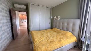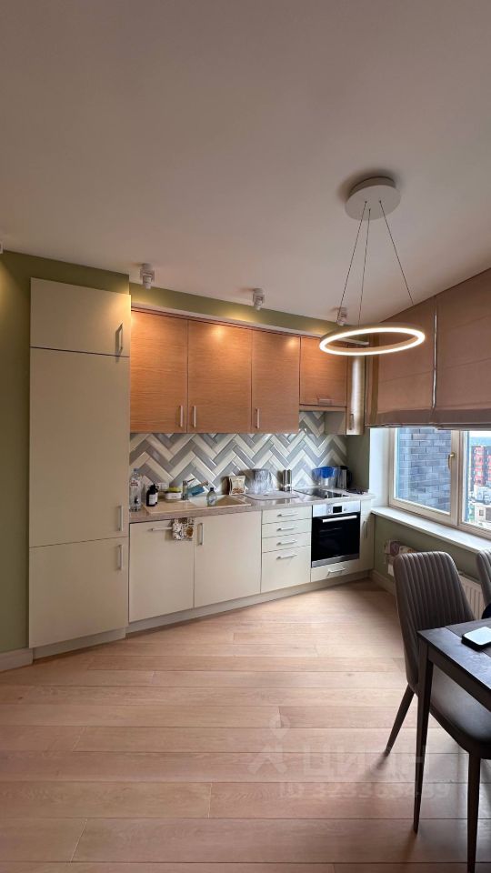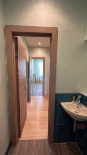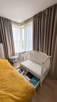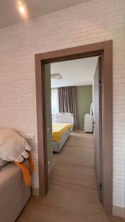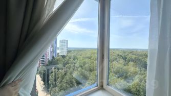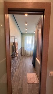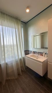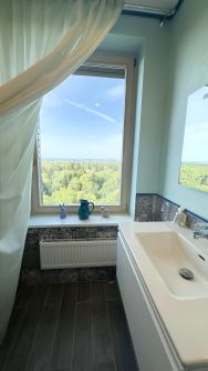 На полу инженерная доска, окна деревянные с современным стеклопакетом и очень хорошей звукоизоляцией. В ванной есть панорамное окно с видом на лес. Сделан дизайнерский ремонт. Квартира не планировалась под сдачу, а делали ее для себя.