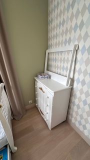 Вся мебель. Обеденный стол со стульями, диван раскладной в кухне-гостиной, мастер кровать, детская кровать (до 4 лет точно можно использовать), комод детский, шкаф в мастер-спальне, шкаф в прихожей, стеллаж в гардеробе.