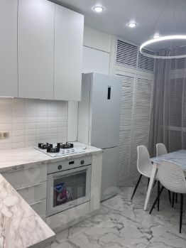 В квартире есть всё необходимое для комфортного проживания. Просторная кухня оснащена современной мебелью и техникой, включая посудомоечную машину и холодильник. В комнате также имеется мебель, а для удобства жильцов установлены кондиционер и телевизор. Ванная комната оборудована ванной и стиральной машиной.