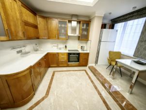 В просторной квартире есть всё необходимое для проживания: в коридоре вместительный встроенный шкаф; в комнате отдельная гардеробная, двуспальный гарнитур с ортопедическим матрасом (спальное место 1,6*2), кондиционер, утюг, телевизор, шкаф; на кухне гарнитур из массива, встроенная техника варочная электрическая панель, духовой шкаф, посудомоечная машина, чайник, холодильник, обеденный стол и стулья; в ванной качественная сантехника, встроенный шкаф и стиральная машина