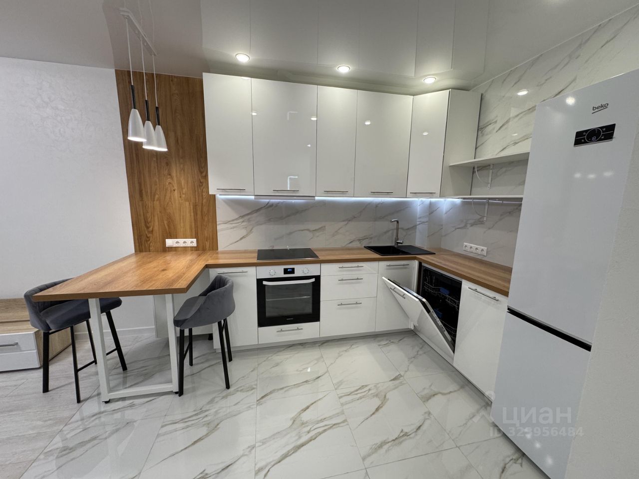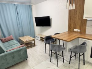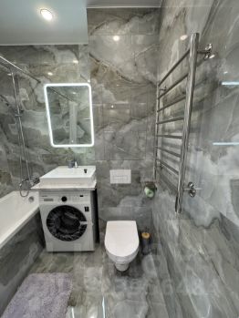 Квартира обставлена мебелью и присутствует вся необходимая техника для жизни (холодильник, посудомоечная машина, варочная панель, микроволновка, стиральная машина, кондиционер, водонагреватель)