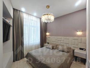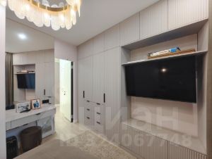 В главной спальне удобная кровать, прикроватные тумбы, вместительные шкафы и большой телевизор напротив кровати. Также установлен туалетный столик с большим зеркалом.