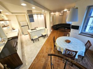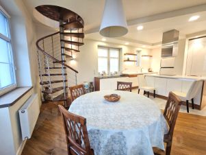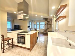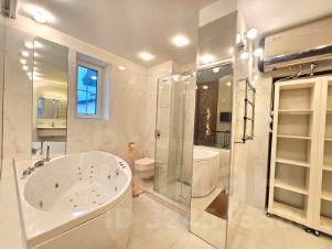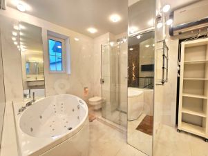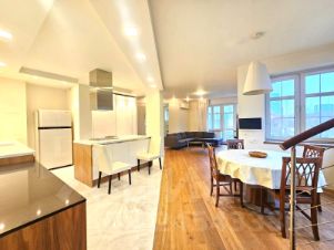 Интерьер выполнен в современном стиле по индивидуальному проекту. В квартире установлена качественная мебель и техника из-за рубежа. В числе удобств климат-контроль, теплые полы, посудомоечная и стиральные машины и бойлер. Отделка выполнена из натуральных материалов: лестница из бука, продуманное освещение и антивандальная краска на стенах.