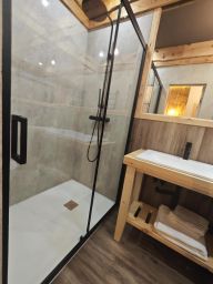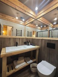 Номера оформлены в тёплом эко-лофт стиле: интерьер создан с использованием натуральных материалов — кело, сухостой сосны и ольхи. Декор продуман до мелочей: мягкий свет, нейтральные тона, натуральные фактуры создают атмосферу уюта и спокойствия, в которой легко расслабиться и восстановить силы после дороги.