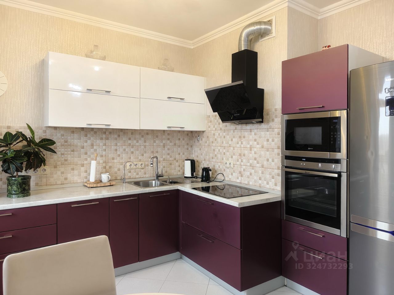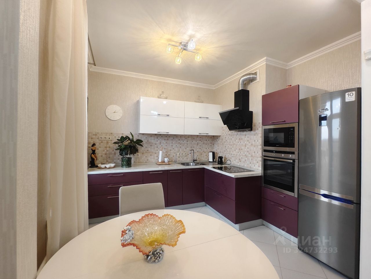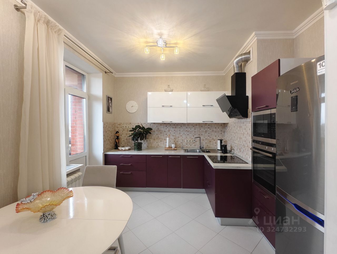 Удобный кухонный гарнитур со встроенной варочной панелью, духовым шкафом, посудомечной машиной и микроволновой печью. Предусмотрена вытяжка подключенная к вентиляции, вместительный холодильник с морозильной камерой. Установлены фильтры для питьевой воды и имеется электрический чайник. Теплые полы для комфортного нахождения на полу их керамогранита. Большой раскладной кухонный стол с комплектом стульев. Из кухонно зоны предусмотрен выход на лоджию с отличным видом на реку.