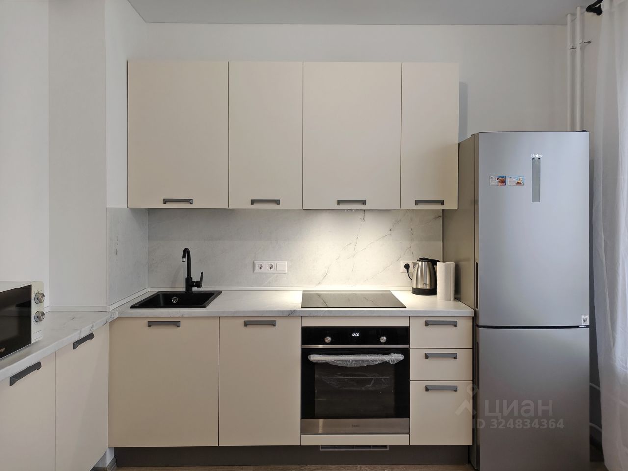 На большой светлой кухне установлена современный кухонный гарнитур, холодильник с морозильной камерой, духовой шкаф, варочная электрическая панель, вытяжка, посудомоечная машина и микроволновая печь.