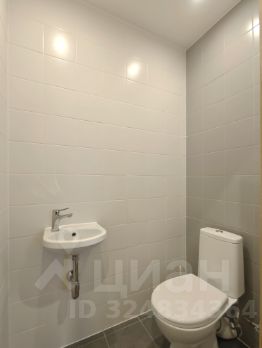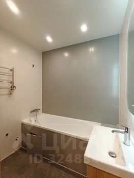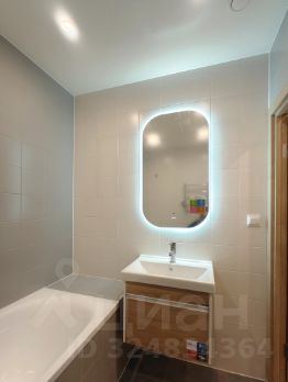 В ванной комнате полноразмерная ванная, раковина над которой висит зеркало с контурной подсветкой, электрический полотенцесушитель и стиральная машина. В туалете предусмотрена также раковина.