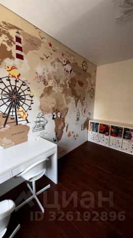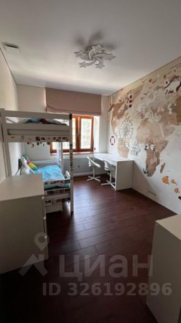 - Детская комната с двухъярусной кроватью для двоих детей. Рабочий столик, два стульчика, комод для одежды и стеллаж для игрушек.