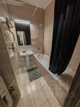 Санузел совмещенный, оформлен современной плиткой, так же есть стиральная машинка.