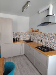 Кухня оборудована гарнитуром со встроенной техникой - холодильник, варочная панель, холодильник, посудомоечная машина.