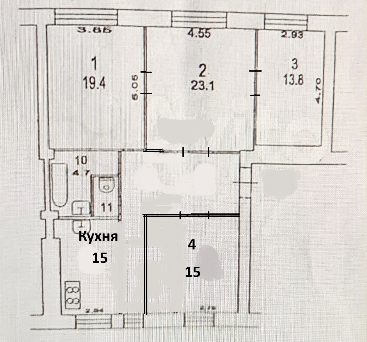 Квартира ОГРОМНАЯ около 105 кв.метров, БОЛЬШАЯ кухня около 16 кв.м., одна комната изолирована около 15 кв.м. с выходом на маленький балкон и три комнаты смежно-изолированные 23 кв.м., 14 кв.м. и 19 кв.м. с выходом на второй большой балкон, просторнейший холл со встроенными шкафами, сан.узел раздельный. ВЫСОКИЕ потолки 3.2 м.