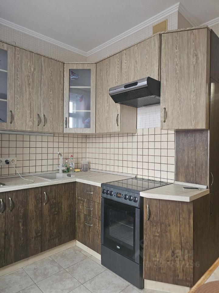 На кухне: кухонный гарнитур, холодильник, духовой шкаф, варочная панель.