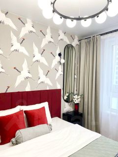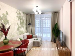 В квартире есть всё необходимое для комфортного проживания: оборудована постирочная с стиральной машинкой с функцией сушки; в кухне-гостиной установлен кондиционер, кухонный гарнитур с посудомоечной машиной и вытяжкой, микроволновка, холодильник, чайник, удобный угловой раскладной диван, кухонный стол со стульями, торшер, телевизор и небольшой комод; в спальне двуспальная кровать, которая при необходимости трансформируется в два отдельных спальных места 90х200 см., платяной шкаф, телевизор, подвесная тумбочка и зеркало; меблировка второй спальни остается на усмотрение жильцов её можно использовать как детскую комнату, домашний кабинет или гостевую комнату, в ней есть мягкий ковёр и журнальный столик; в прихожей функциональная гардеробная, зеркало, wi-fi роутер; в ванной комнате стеллажи для хранения.