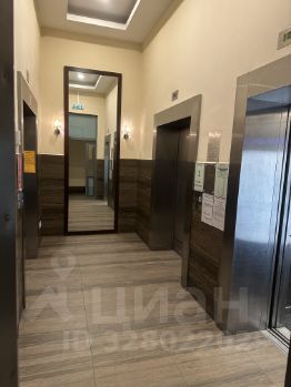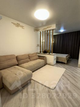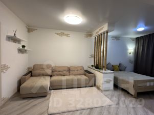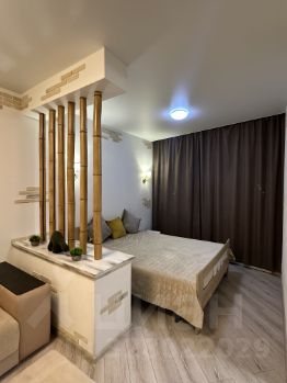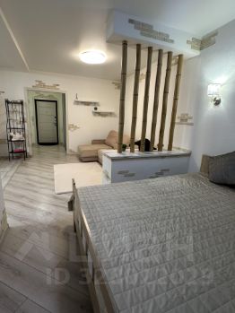 Жилая комната визуально разделена на зону отдыха с большим комфортным угловым диваном и спальную зону с двуспальной кроватью. Для хранения вещей предусмотрено много места: вместительный белый шкаф и большой стеллаж в комнате, а также огромный шкаф-купе с зеркальными дверями от пола до потолка в прихожей.