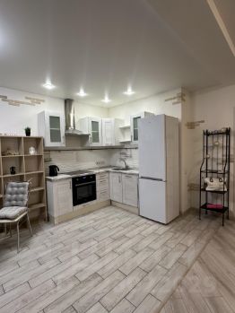 Внутри есть абсолютно всё необходимое. Просторная кухонная зона укомплектована гарнитуром, большим холодильником, духовкой, варочной панелью, вытяжкой и посудомоечной машиной. Выделена обеденная зона со стильным стеклянным столом. В совмещенном санузле установлена полноценная ванна и стиральная машина.