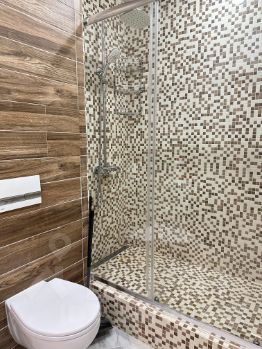 душевая кабина, стиральная машина, комплект полотенец.