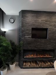 Кухня с подсветкой + декоративный камин — создаёт уют и атмосферу.