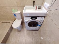 Санузел в керамограните, оснащен душевой кабиной, стирально-сушильной машиной, зеркалом с подсветкой и антизапотеванием.