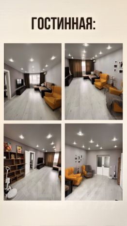 — Большая гостиная с мягким диваном, огромным телевизором и большими окнами