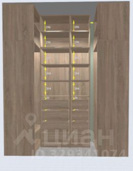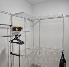В кладовое помещение (6м2) вход с коридора. Оно оснащено сетчатой системой хранения (можно дополнить по запросу), передвижной вешалкой на колёсиках, там же находятся пылесос, стремянка и гладильная доска.
