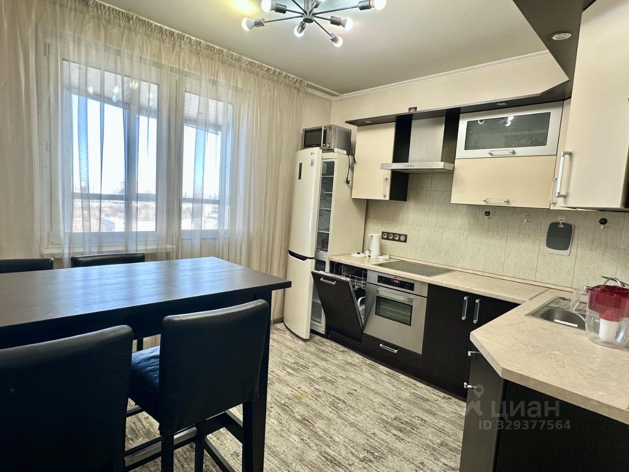 Кухня площадью 10 кв. м оснащена встроенной мебелью и современной техникой: холодильник, посудомоечная машина, духовой шкаф, микроволновая печь и телевизор.