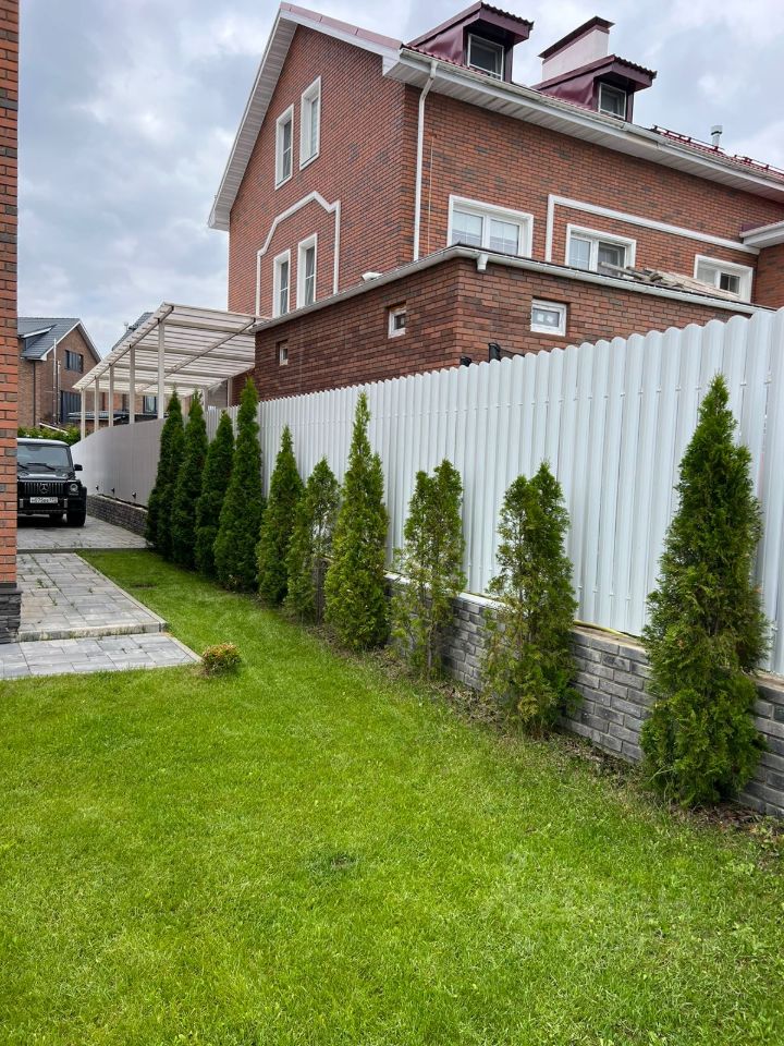 На улице расположена парковка на 3 машины,Территория участка засажена хвойными растениями и постелен газон . За забором высажены сосны и кедры
