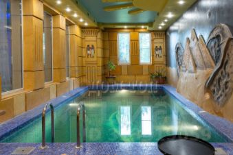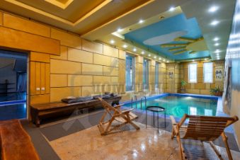 СПА-зона: подогреваемый бассейн 8,5*5,5*1,9 на 60 тонн, шезлонги, деревянный стол со скамьей. Скраб-мастерская, массажный кабинет, гостиная с камином. Уникальная парная с колоколами (виброзвуком), не имеющая аналогов в Мире.