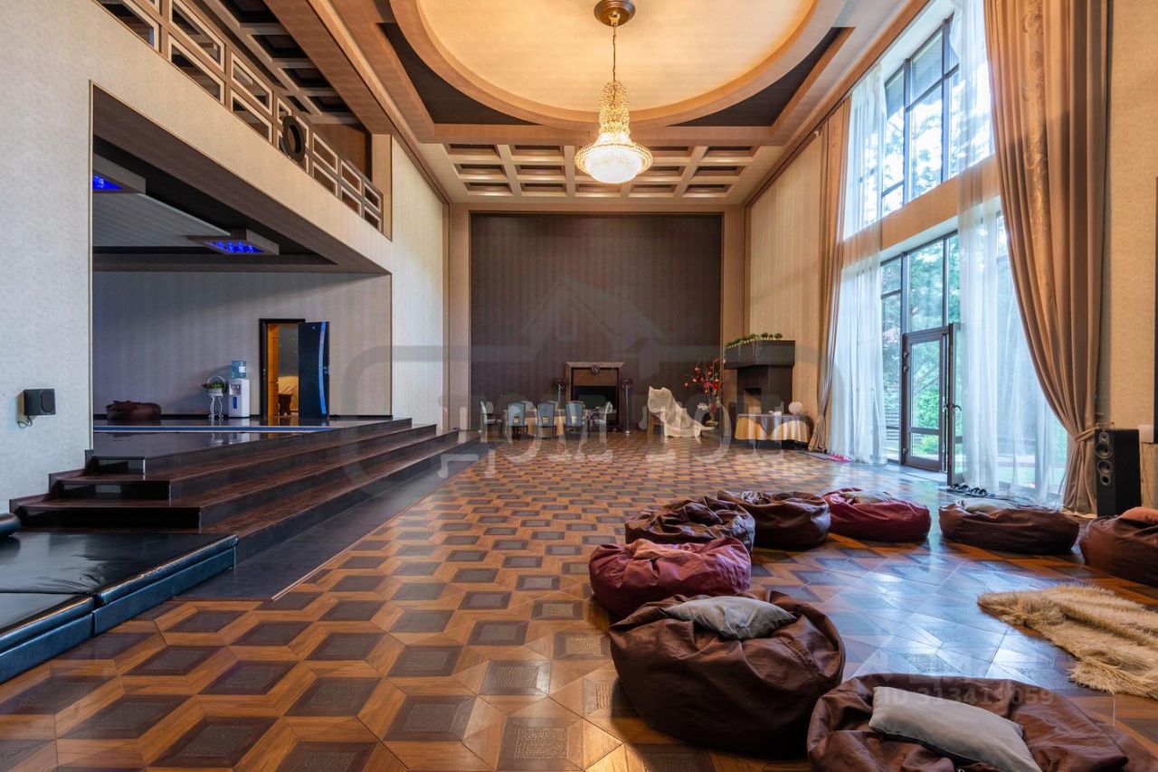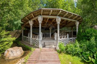 УЧАСТОК: благоустроенный 30 соток. Ландшафтный дизайн. Множество деревьев и кустарников. На территории имеется деревянный стол со стульями на 20-25 персон. Искусственный пруд, в котором живут царские осетры, с каскадным трехуровневым водопадом с подсветкой. Огромный сеновал - шале. Банный чан на 8 человек с собственной беседкой. Деревянная сцена. Шаманская/сенная баня юрта. Мангальная зона. Парковка на 13 автомобилей.