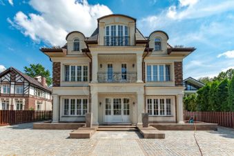 Внешняя отделка выполнена из дорогостоящих, качественных материалов: натуральный камень (известняк), медь, клинкерный кирпич ручной формовки, клинкерная черепица BRAAS, художественная ковка, дубовые окна, гранитный цоколь