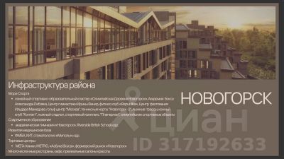 Семейный спортивно-образовательный кластер Олимпийская Деревня Новогорск, Академия бокса Александра Лебзяка, Центр гимнастики Ирины Винер, фитнес клуб Republika, Центр фехтования Ильдара Мамедова, Академическая Гимназия с углубленным изучением английского языка, современный детский сад, рестораны, кафе и магазины. В непосредственной близости расположены лыжные трассы, гольф-, теннисный клуб, олимпийские объекты, поликлиники, и самое главное сотни гектар леса вокруг!!!