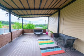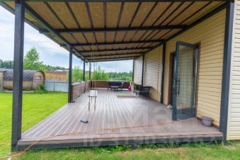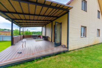 Планировка дома включает в себя прихожую, кухню, просторную гостиную с выходом на террасу 45 м2 с качелями, санузел, 4 спальни.