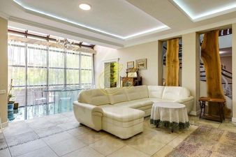 В гостиной расположен большой и удобный диван, а также обеденный стол, который стоит на стеклянном полу и под стеклянной крышей, наполняющей помещение светом.