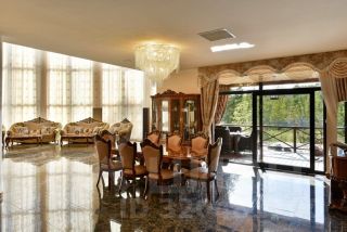 Качество строительства и отделочных работ в этом доме находится на высшем уровне. Интерьер выполнен в классическом стиле в светлых пастельных тонах, что делает его светлым и атмосферным. Панорамное остекление и высокие потолки добавляют дому света и воздуха. Мебель и предметы интерьера подобраны со вкусом, украшая пространство.