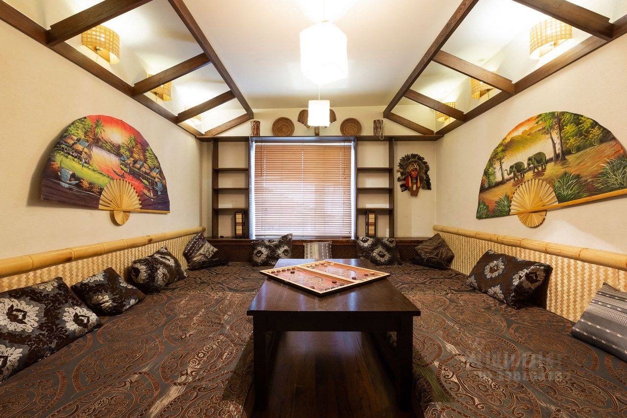 1 этаж: гостиная с камином в охотничьем стиле, кинотеатр, караоке, кухня, оборудованная всей необходимой техникой, 2 спальни, комната в японском стиле, сауна, бассейн с подогревом, зимний сад, с/у с ванной.