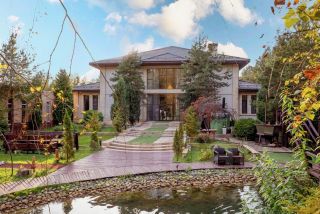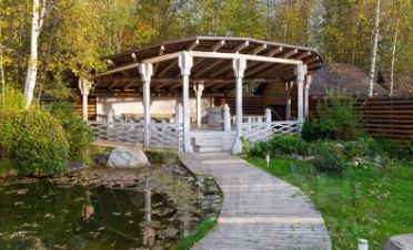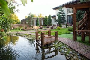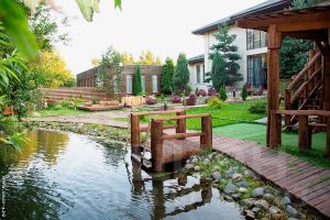 На участке: декоративные деревья и кустарники, зарыбленный пруд с мостиком, большая беседка с барбекю и мангалом до 20 человек.