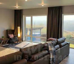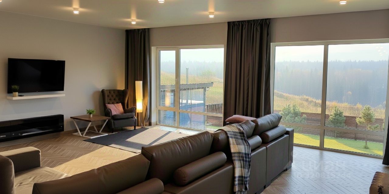 Комфорт внутри: Продуманное одноэтажное пространство с просторной кухней-гостиной и панорамными окнами, открывающими захватывающий вид на лес и реку.
