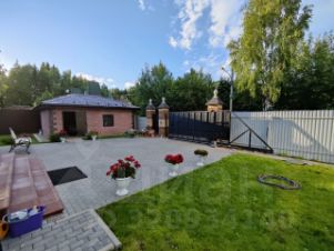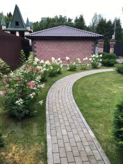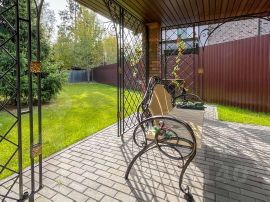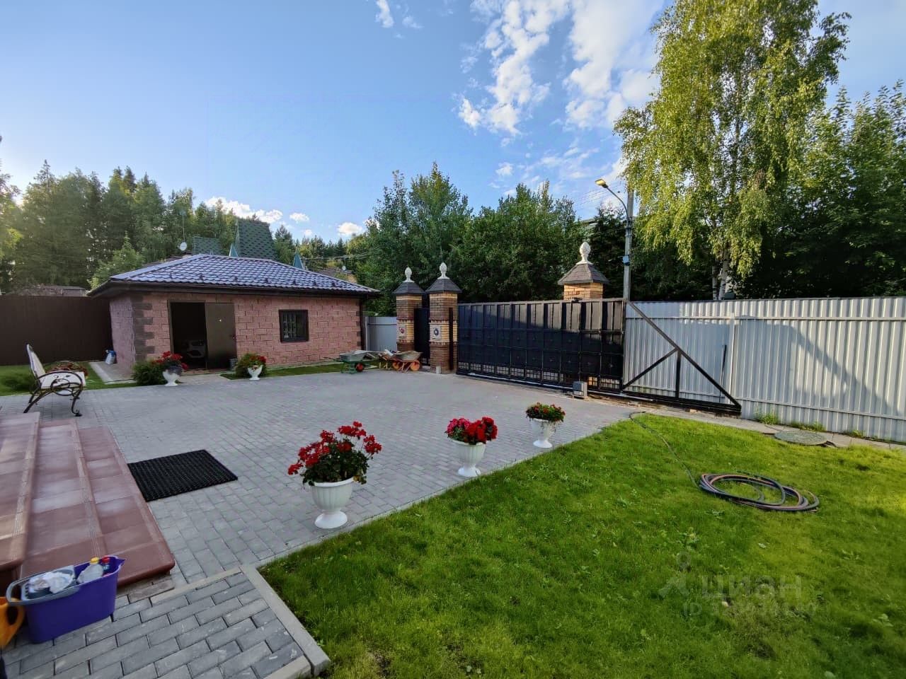 Участок ИЖС с ландшафтным дизайном и лесными деревьями. На участке также расположены гараж, беседка, зона барбекю, открытая стоянка для машин с откатными воротами.
