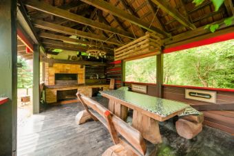 Коттедж имеет уникальный архитектурный стиль. Общая площадь дома составляет 500 м2, что позволяет разместить до 20 гостей одновременно в 6 уютных спальнях.