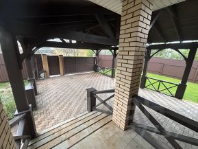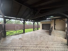 Без комиссии, предлагаем Вашему вниманию 2-х этажный дом + просторный цокольный этаж. С тыльной стороны уютная веранда. На участке высажены туи, подстрижен газон. Навес на несколько машин перед гаражом, большая площадка с вымощенной плиткой. На первом этаже расположена просторная кухня-гостиная-столовая на площадь всего этажа с выходами на веранду, цокольный этаж и гараж. При входе - гостевой санузел. На втором этаже расположены три спальни и хозяйский просторный санузел. На цокольном этаже - домашний кинотеатр с широким экраном и удобным диваном и комната для игры в теннис, возможно установить бильярд. Бойлерная. Участок огорожен забором по периметру, высажены хвойные деревья. Уютно, атмосферно. Хорошее окружение. В деревне несколько магазинов, работает доставка. Приглашаем арендаторов на длительный срок.
