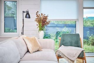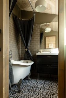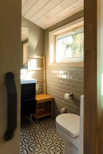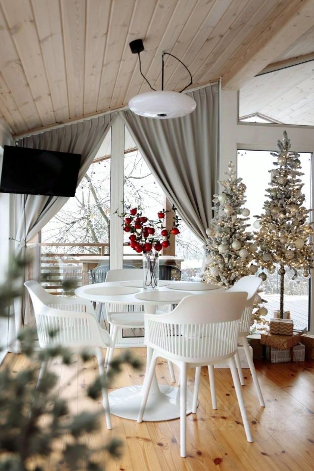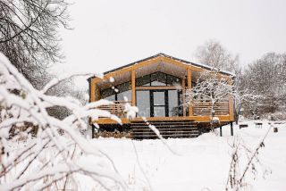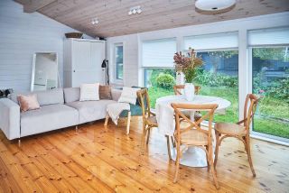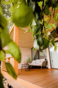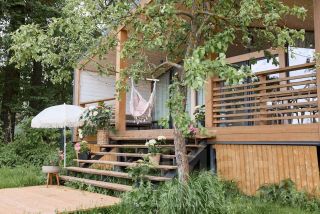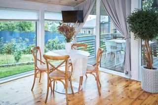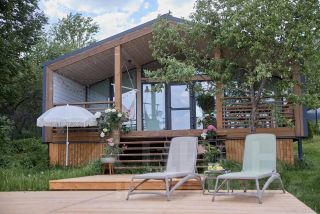 Состоит из просторной кухни- гостиной, оснащённой современной бытовой техникой ( посудомоечная машина, духовой шкаф, микроволновка, индукционная плита), изолированной спальни с двухспальной кроватью с панорамным остеклением, атмосферной ванной комнатой с ванной на львиных лапах и большой верандой с ламповым декором, оснащённой садовой мебелью для отдыха в тёплое время года ( обеденная группа, лаунж- зона, кресло- гамак, шезлонги)