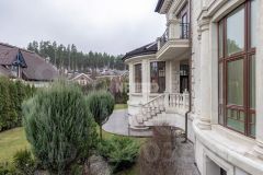 Фасады отделаны искусственным камнем и гранитом, площадки, дорожки из гранита. Кровля- немецкая черепица Braas с медными водостоками.