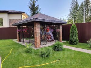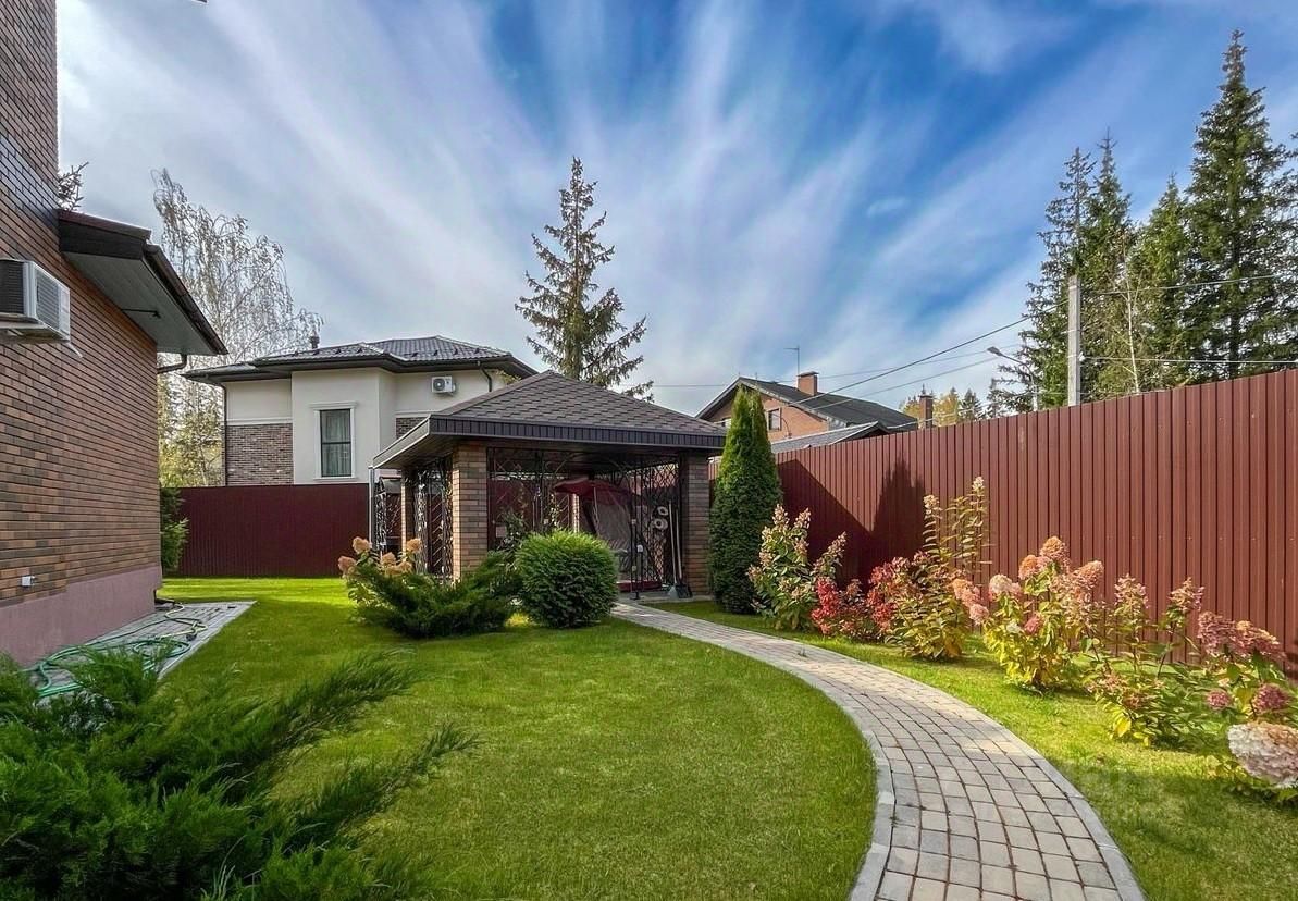 Участок ИЖС с ландшафтным дизайном и лесными деревьями. На участке также расположены гараж, беседка, зона барбекю, открытая стоянка для машин с откатными воротами.