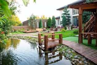 Территория вокруг дома заслуживает отдельного восхищения. Ландшафтный дизайн с декоративными деревьями и изящными кустарниками создает атмосферу уединенного парка. Живописный зарыбленный пруд с аккуратным мостиком станет прекрасной локацией для свадебной фотосессии. Для любителей отдыха на свежем воздухе предусмотрена большая беседка, оборудованная всем необходимым для приготовления блюд на углях и барбекю.