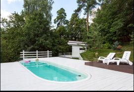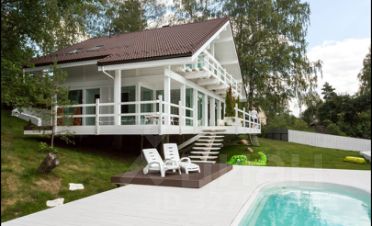 На большом участке(площадью 35 соток)имеется бассейн с подогревом и шезлонгами,баня.