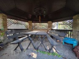 На участке ландшафтный дизайн, лес, плодовые деревья, беседка и мангал для шашлыка.