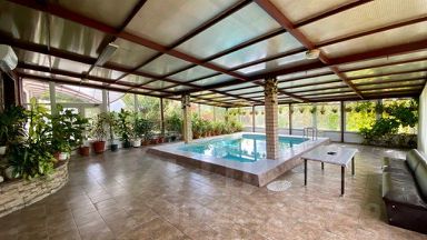 На первом этаже: гостиная с камином, домашним кинотеатром, караоке, полностью оборудованная кухня; комната в японском стиле; 2 спальни; электрическая сауна, бассейн с подогревом и противотоком в зимнем саду; туалет с ванной.