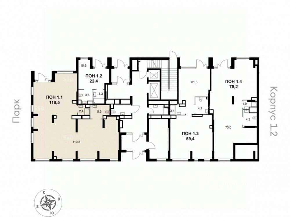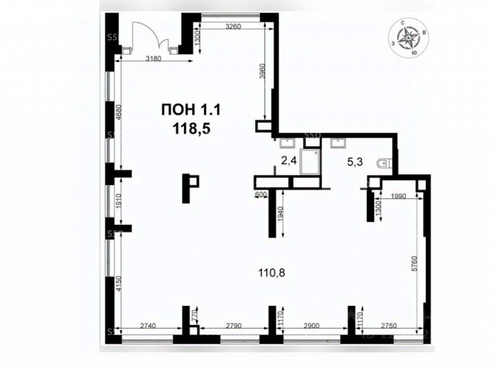 Корпус 1.3, первая линия. Угловое помещение общей площадью 117.8 кв. м., 1 этаж.