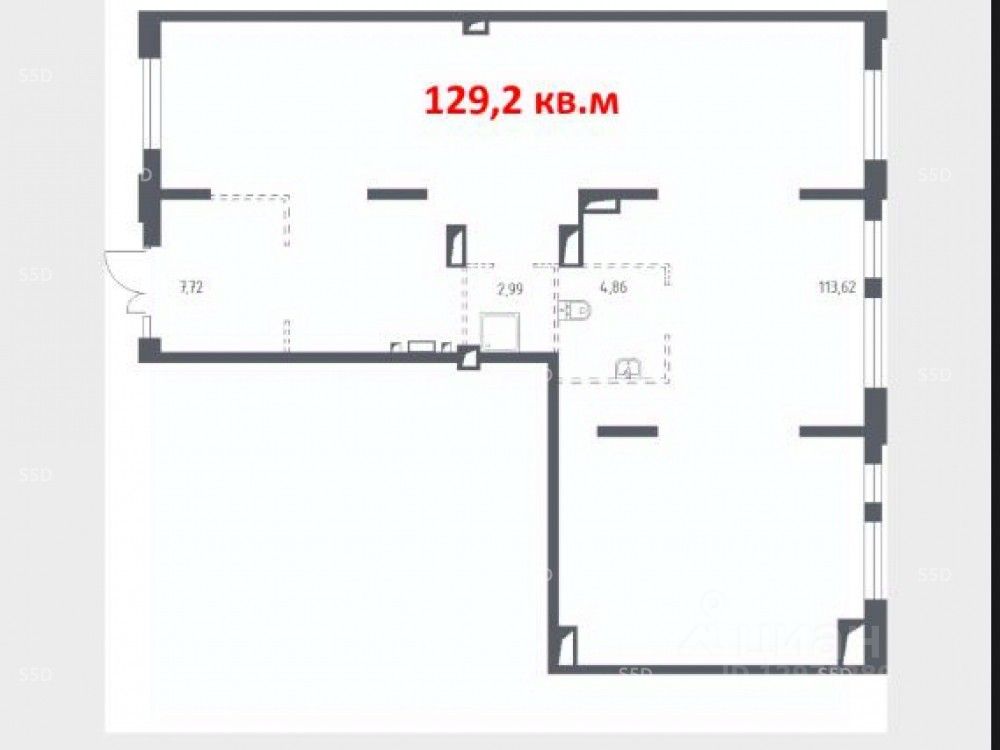 Помещение площадью 129,2 м2 на первом этаже 11-ти этажного жилого дома. Отдельный вход с улицы, свободная планировка. Высота потолков 4 м, электричество - 21 кВт.