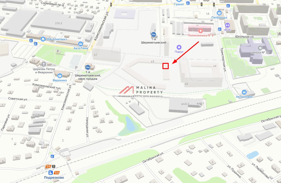 Помещение располагается в новом жилом комплексе 1-ый Шереметьевский. Находится в центре ЖК. В шаговой доступности от МЦД-3 "Подрезково" . Ввод в эксплуатацию 1 квартал 2027 года.